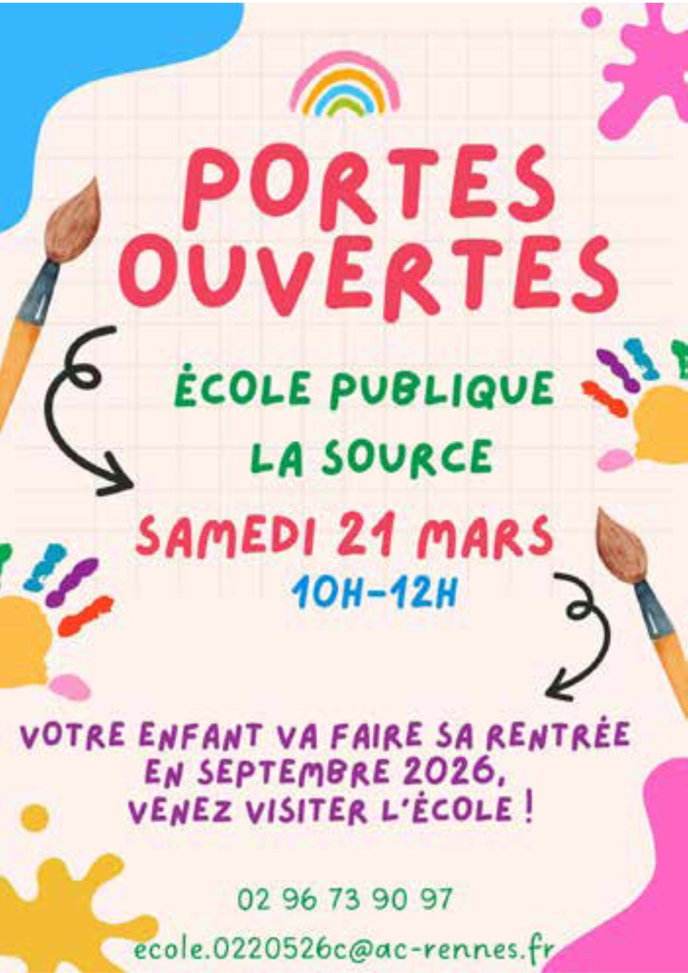 Votre enfant va faire sa rentrée en septembre 2026 ? Venez visiter l'école.Contact :Ecole publique La Sourcetél. 02.96.73.90.97mail : ecole.0220526c@ac-rennes.fr